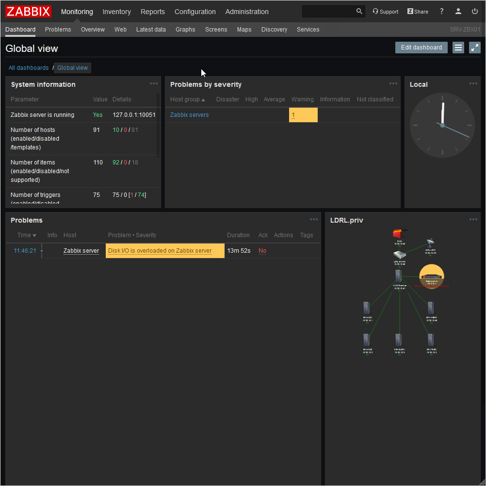 L’un des outils indispensables dans un réseau informatique est le monitoring. J’ai fait le choix d’installer « Zabbix » car son interface est entièrement personnalisable et permet d’afficher sur le tableau de bord uniquement les informations les plus importantes. Le fonctionnement est très simple. Il y a un agent à installer sur chacune des machines à monitorer. Il faut ensuite créer ces dernières sur l’interface d’administration de zabbix. L’agent monitore ensuite les services Windows, la disponibilité de la machine avec du ping… Pour les éléments de cœur de réseau (switch, router…) sur lesquels il n’est pas possible d’installer un agent, on peut simplement créer l’hôte sur zabbix et lui mettre une requête de ping continu.